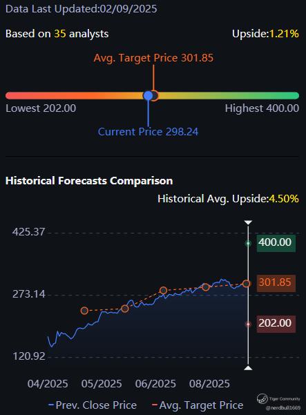 Based on 35 analysts from Tiger Brokers offering 12 month price targets for Broadcom in the last 3 months. The average price target is $301.85 with a high forecast of $400.00 and a low forecast of $202.00. The average price target represents a 1.21% change from the last price of $298.24.