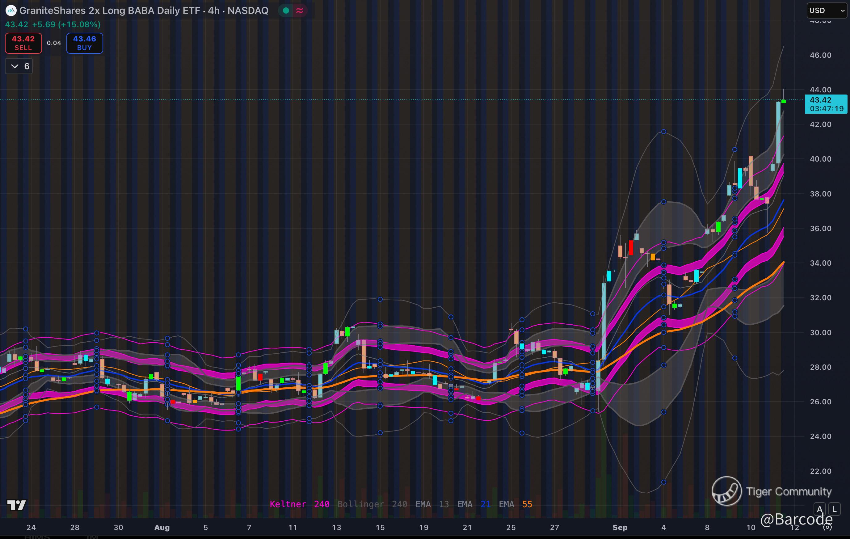 Iβm fully convinced GraniteShares 2x Long BABA Daily ETF ($BABX) is in the middle of a structural breakout. Iβve watched this trade accelerate for two sessions straight, fueled by a surge in liquidity and volume that signals institutions are stepping in, not just retail momentum. Price has already exploded +15% into $43.52, and I believe this isnβt the end of the move.