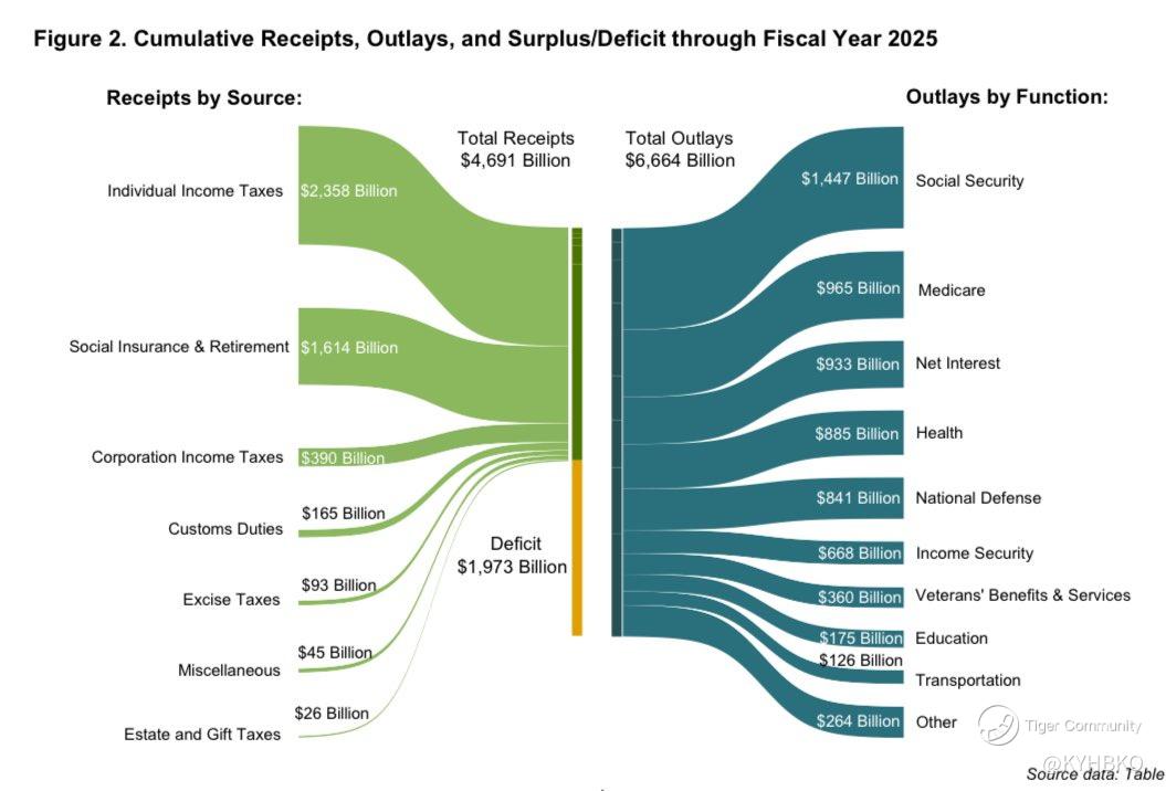 A chart displaying cumulative receipts and outlays for Fiscal Year 2025. Receipts are categorized into individual income taxes, social insurance and retirement, corporation income taxes, customs duties, excise taxes, miscellaneous, and estate and gift taxes, with amounts in billions. Outlays are categorized into social security, Medicare, net interest, health, national defense, income security, education, and other, also in billions. A deficit of $1,973 billion is shown between total receipts of $4,691 billion and total outlays of $6,664 billion.