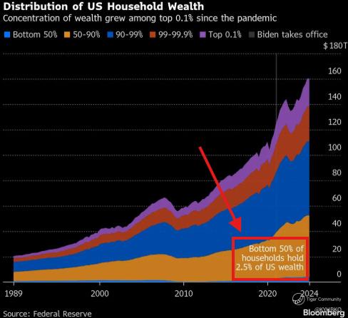 A line chart showing the distribution of US household wealth from 1989 to 2024. Colored bands represent wealth percentages for different income groups: bottom 50% in blue, 50-90% in yellow, 90-99% in red, 99-99.9% in brown, and top 0.1% in purple. The chart indicates a significant increase in wealth concentration, with the bottom 50% holding 2.5% of total US wealth. A red arrow and text box highlight the bottom 50% data point. Bloomberg watermark is present.