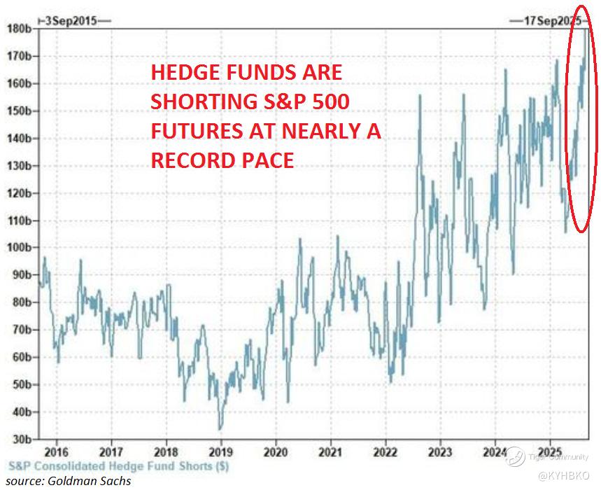 Hedge funds are shorting the S&P 500 futures at nearly a RECORD pace: Hedge funds short exposure to the S&P 500 futures hit $180 BILLION, an all-time high. As a share of open interest, shorts hit ~27%, the highest in 2.5 years, only below March 2023 and September 2022. - X user Global Markets Investor