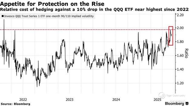 The cost of hedging against a 10% drop in the Nasdaq 100 ETF, $QQQ, relative to bullish bets has jumped to its highest since the 2022 bear market. The relative cost of hedging has risen by ~40% over the last 5 months. As a result, downside protection on $QQQ is now higher than it has been in all but 8% of recent cases. Investors are adding hedges to protect long equity holdings from a potential market drop. This also signals growing caution ahead of the long-anticipated September Fed meeting next week. All eyes are on the Fed. - X user The Kobeissi Letter