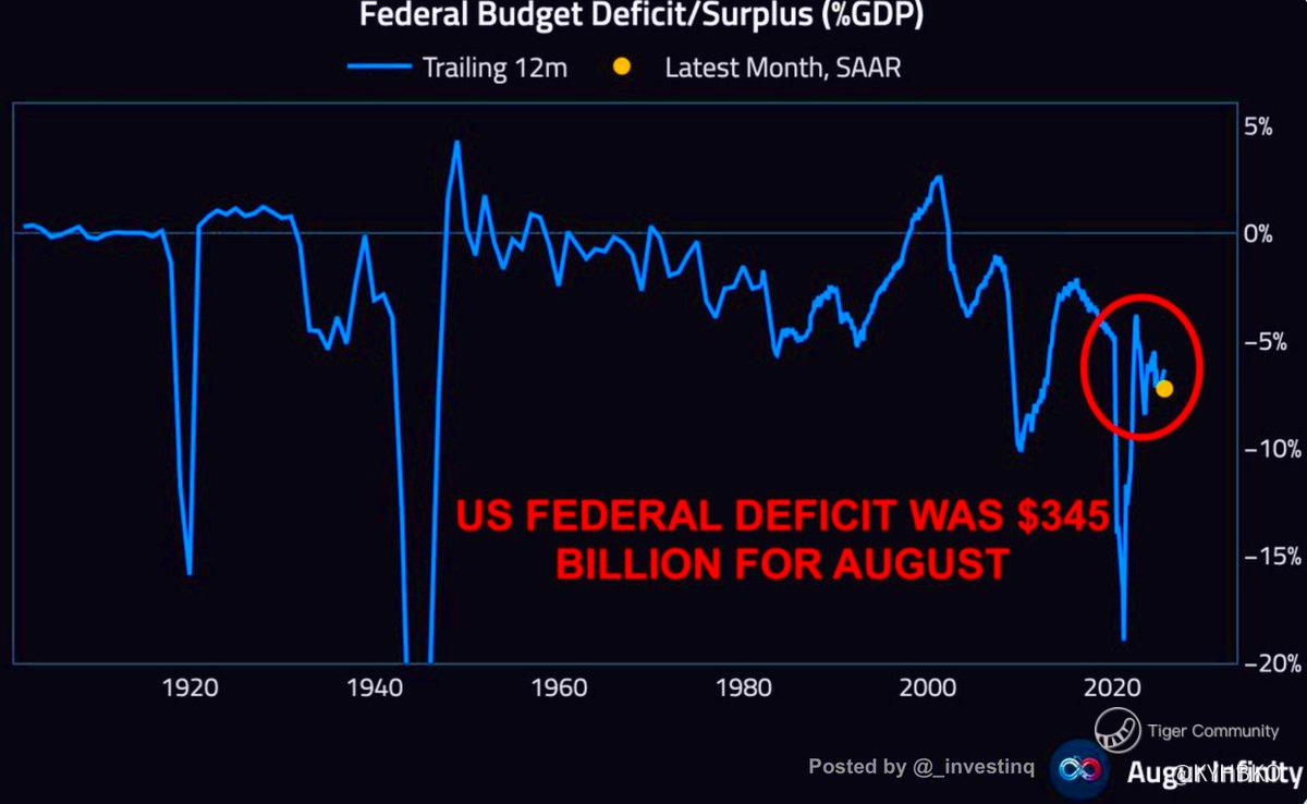 The U.S. is running deficits on a crisis scale. August’s $345B shortfall works out to nearly 7% of GDP, a level far above anything seen from the 1950s through the 1990s. For the first 11 months of FY2025, the deficit has already reached $1.97 trillion. That’s the third-largest in U.S. history, and we’re not even done with the year. We’re not steering the ship anymore, we’re just hoping it doesn’t sink. - StockMarket News