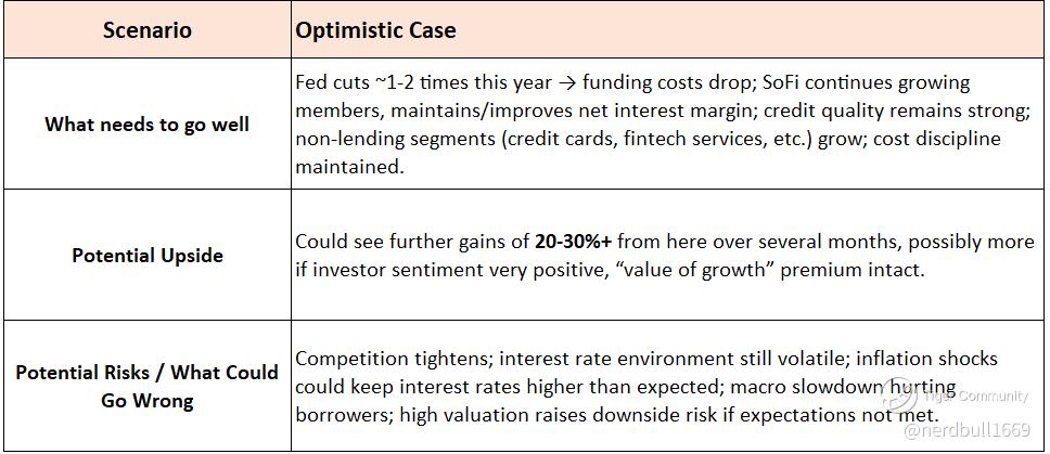 Given what SoFi is showing now, and if rate cuts come (say 1-2 by year end), SoFi is fairly well placed to continue its upward momentum. But I think the upside might be more in the base case than in the overly optimistic case, unless everything goes very well.