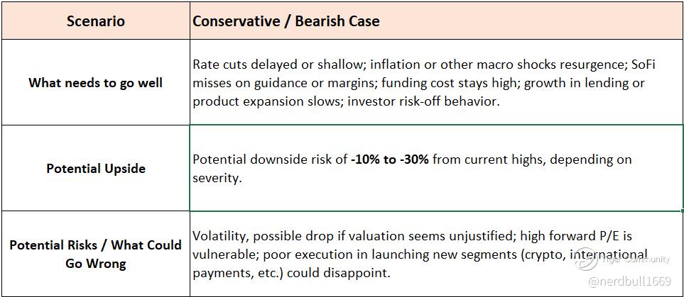 Pullback (Correction)20% — cuts delayed or inflation surprises, or SoFi misses guidance / credit deteriorates; re-rating to analyst targets.