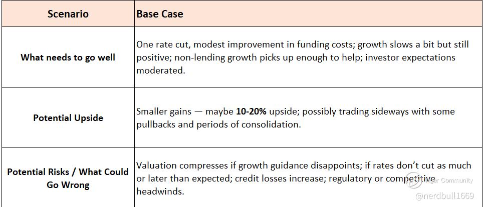 Base (Choppy / modest upside)50% — one cut, improved funding costs, growth continues but with volatility; stock grinds higher modestly.