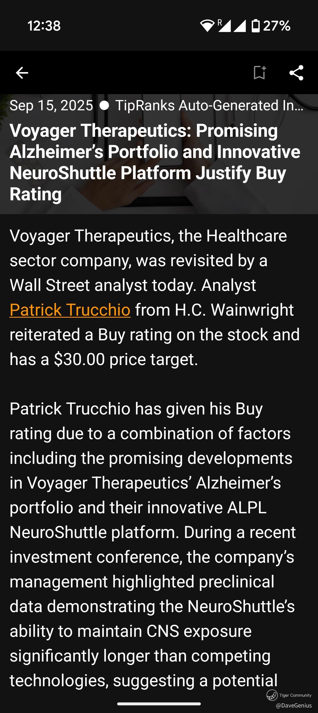 $Voyager Therapeutics(VYGR)$ my trail stop loss was triggered. Maybe I set it too low but bio tech stocks are very risky so better to take the money and run.