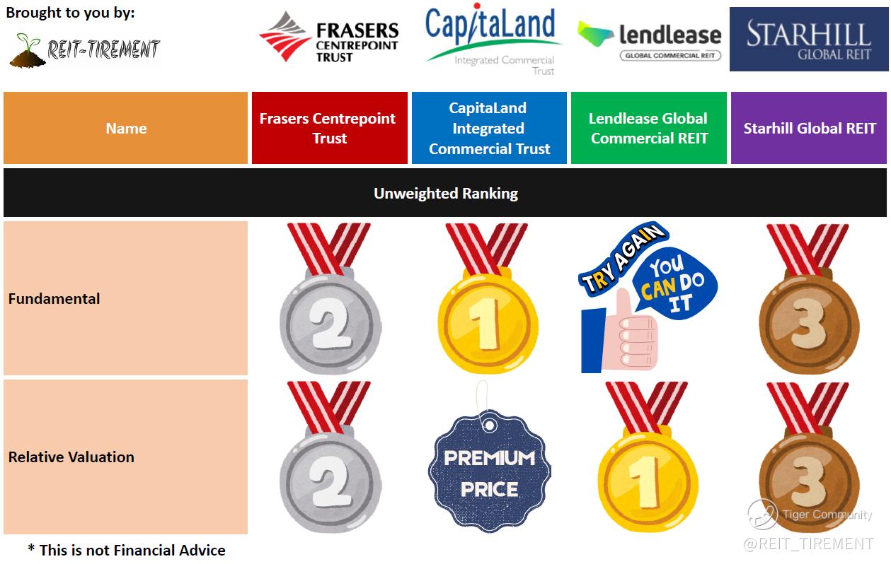 The above is just a quick comparison without weightage assigned. For more information, check out REIT-TIREMENT