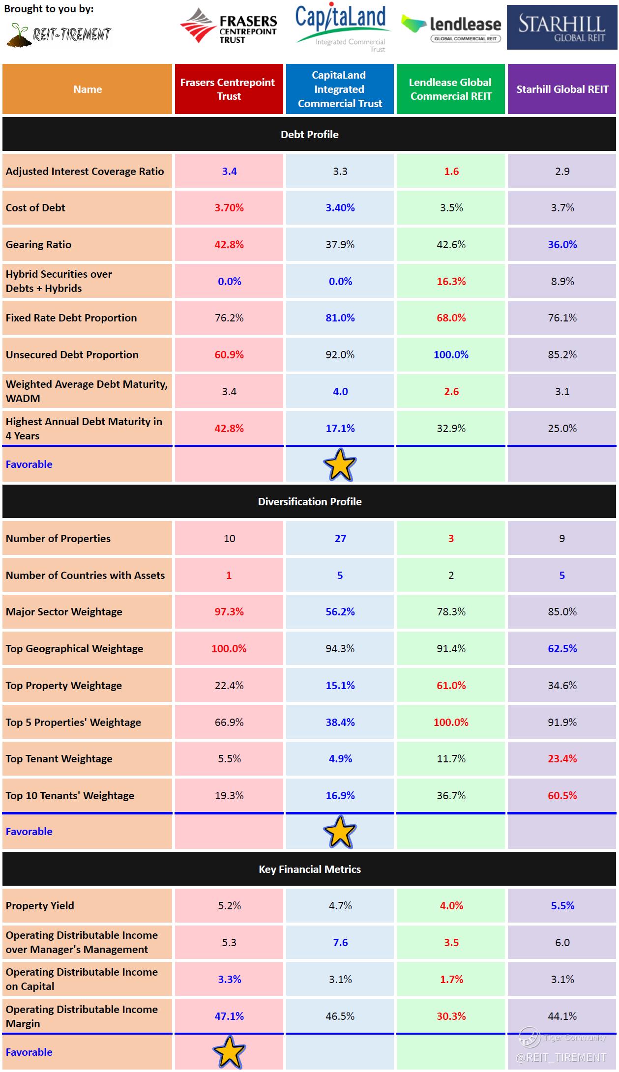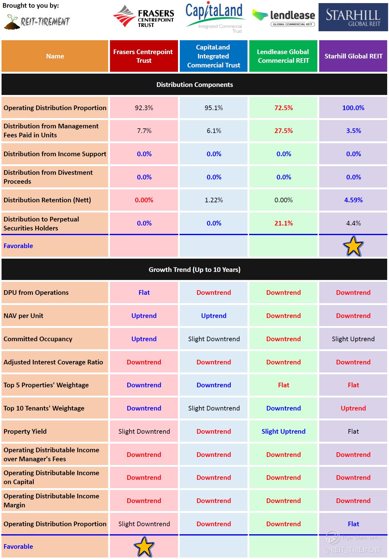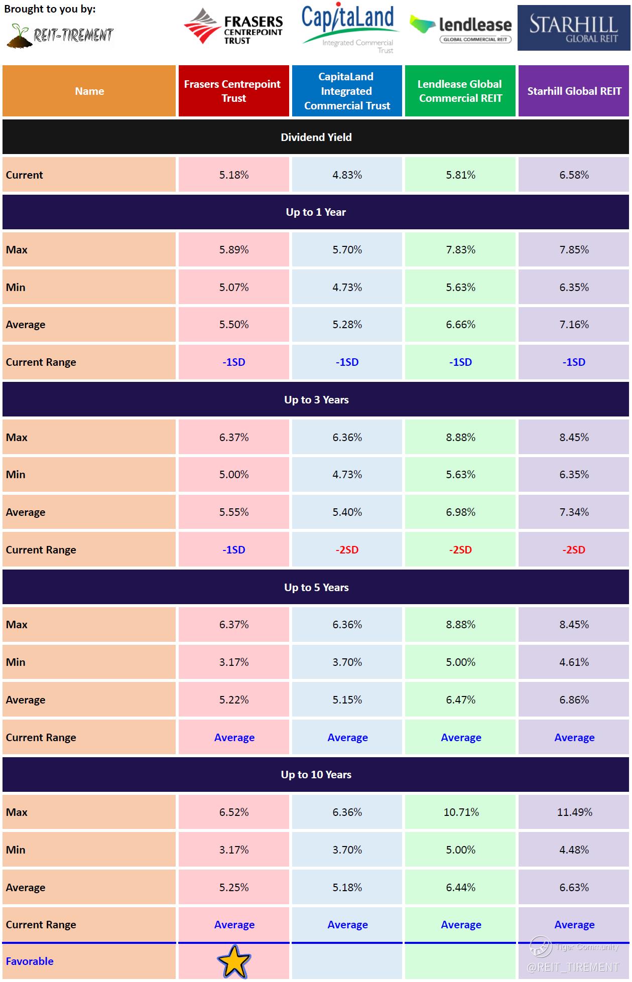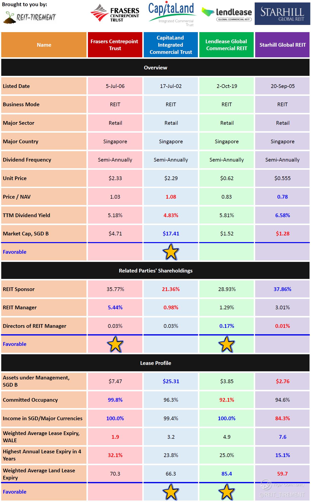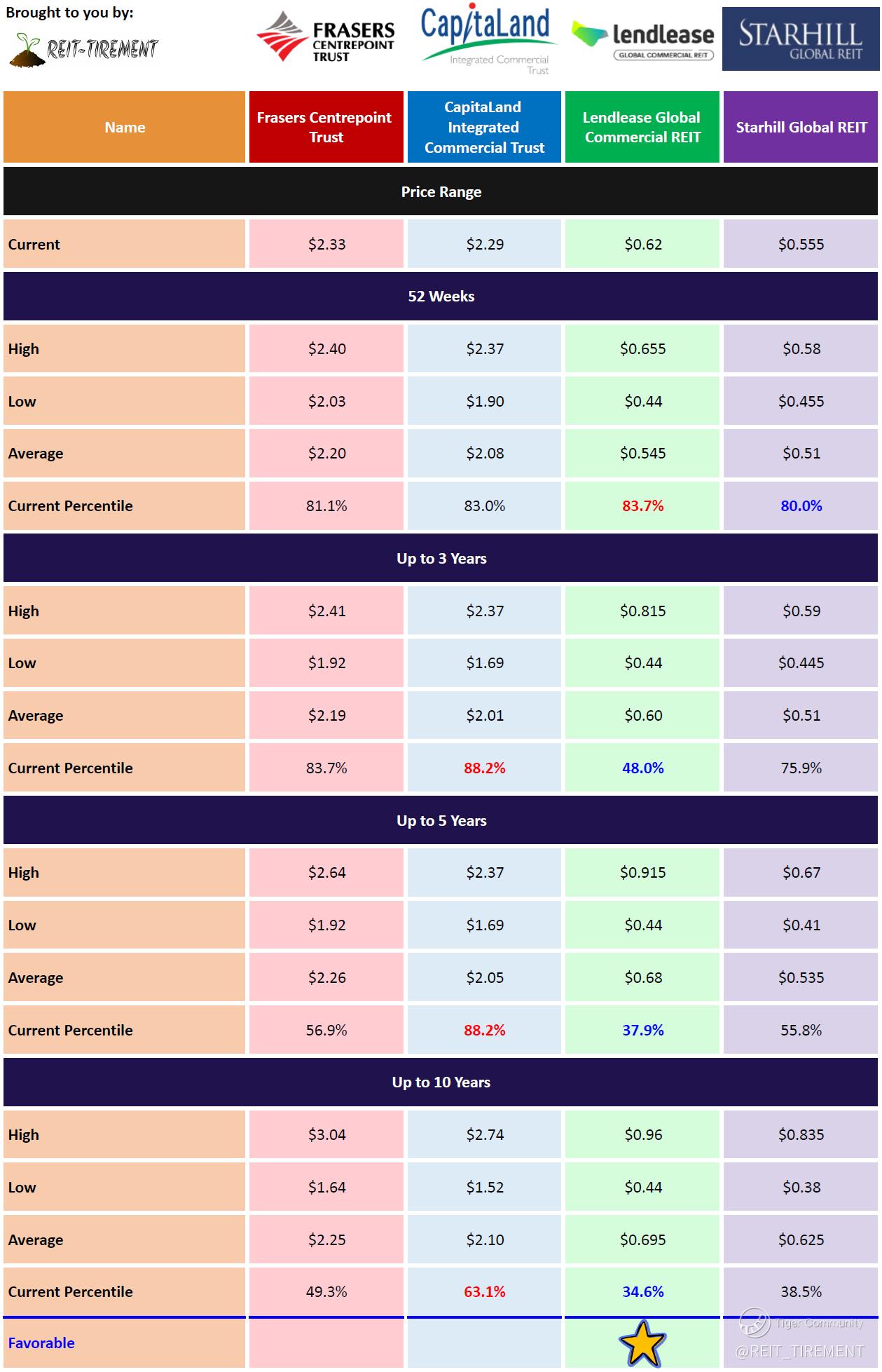 $Lendlease Reit(JYEU.SI)$ $CapLand IntCom T(C38U.SI)$ $Frasers Cpt Tr(J69U.SI)$ $StarhillGbl Reit(P40U.SI)$