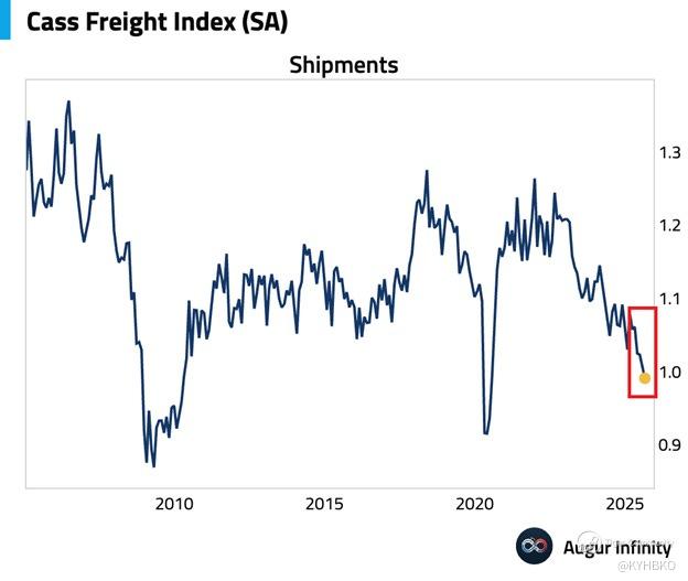 US freight is in a recession: The Cass Freight Index dropped -9.3% YoY in August, hitting its lowest level since 2020. This index tracks freight shipments within North America and serves as a key gauge of US shipping activity. August marks its 28th consecutive monthly decline. Freight shipments have now fallen -20% over the last 3 years. The last time such a prolonged fall occurred was during the 2008 Financial Crisis. Goods movement in the US is slowing sharply. - X user The Kobeissi Letter