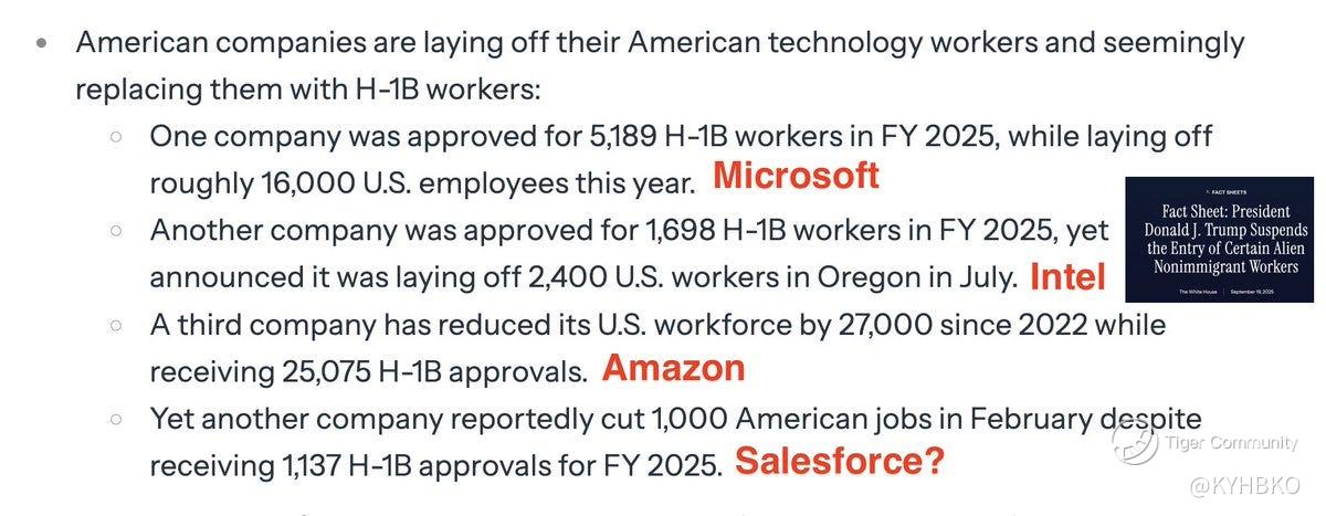 A screenshot of a social media post with black text on a white background. The text lists four bullet points about American companies laying off U.S. technology workers while receiving H-1B visa approvals. Names mentioned include Microsoft, Intel, Amazon, and Salesforce.