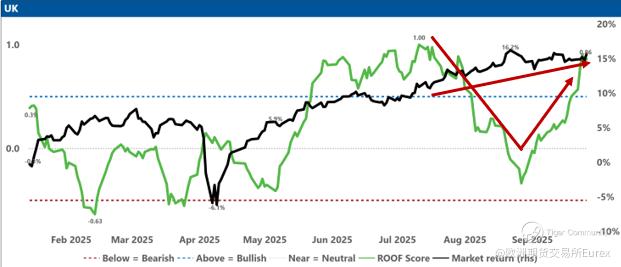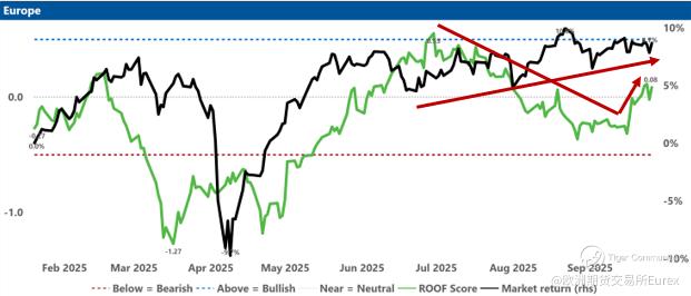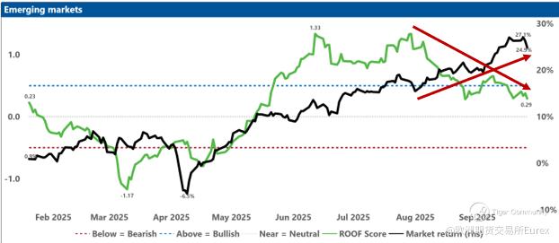 The top charts illustrate the ROOF ratio, which represents investor sentiment. This ratio is depicted in green on the left axis, while the cumulative returns of the underlying market are shown in black on the right axis. Key reference lines include:
