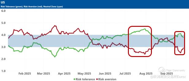 The bottom charts display the levels of risk tolerance (green line) and risk aversion (red line) within the market, representing investors' demand and supply for risk, respectively. Key insights include: