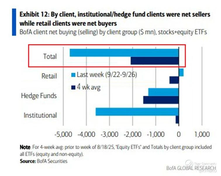 Institutional investors are cashing in gains: Investors sold -$4.7 billion of US equities last week, driven by single stocks. Outflows from single stocks rose by $500 million, to -$5.7 billion, making the last 2-week outflow the 3rd-largest since 2008. This was led by institutional investors who dumped -$3.6 billion, the most since June, after -$1.4 billion in the prior week. Hedge funds sold -$1.3 billion, posting their 3rd consecutive weekly outflow. Meanwhile, retail investors turned to buying for the first time in four weeks, at +$200 million. Wall Street is selling to Main Street again. - The Kobeissi Letter