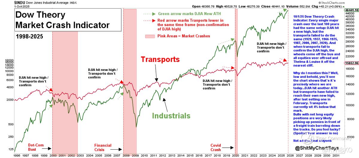 Dow Theory Crash Indicator: Every single major crash over the last 100 years had the same setup: DJIA hit a new high, but the transports failed to do the same (1929, 1937, 1966-1975, 1987, 2000, 2007, 2020). And when transports fail to confirm the DJIA high, the wheels come off the bus and all equities veer offroad and Thelma & Louise it off the nearest cliff. Why do I mention this? Well, low and behold, you`ll see the chart shows that`s it`s precisely where we are today...DJIA hit another ATH but transports have failed to reach their own new high, after last setting one in February. Transports currently sit 4% below that mark. Bulls with net long equity positions are very likely picking up pennies in front of a freight train barreling down the tracks. Do you feel lucky? (Spoiler: Your answer is no) - X user Sh!tmychartsays