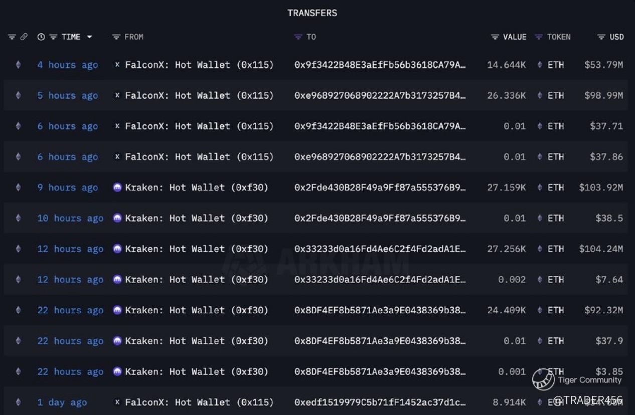 6 new wallets (likely belonging to #Bitmine) withdrew 128,718 $ETH ($480M) from #FalconX and #Kraken.