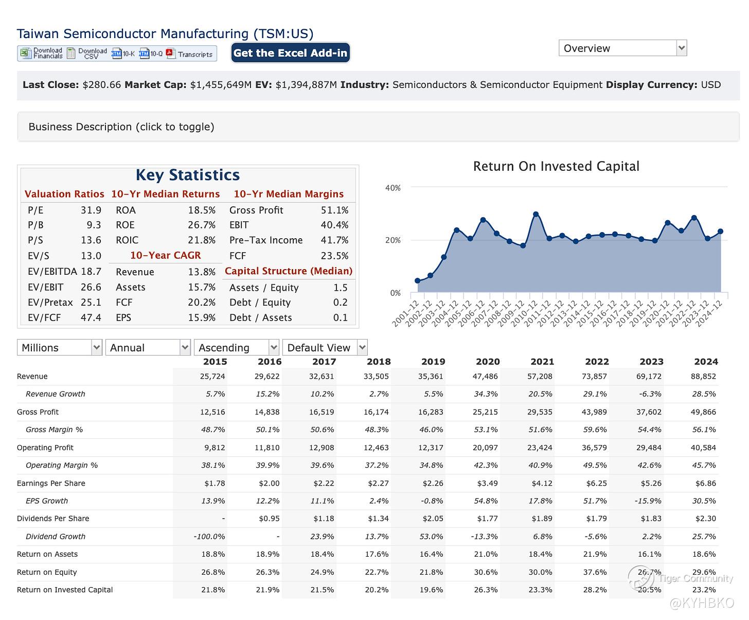 This summary provides a professional analysis of TSMC’s key financial metrics, sorted by profitability, growth, and balance sheet health, covering the period from 2015 to 2024.