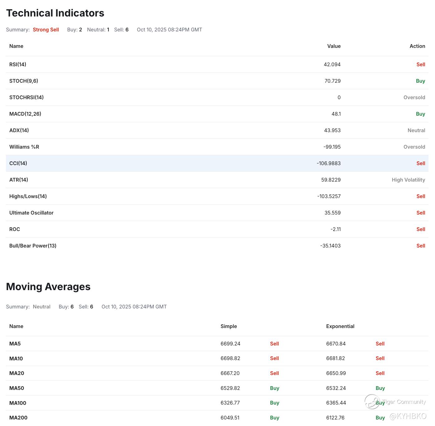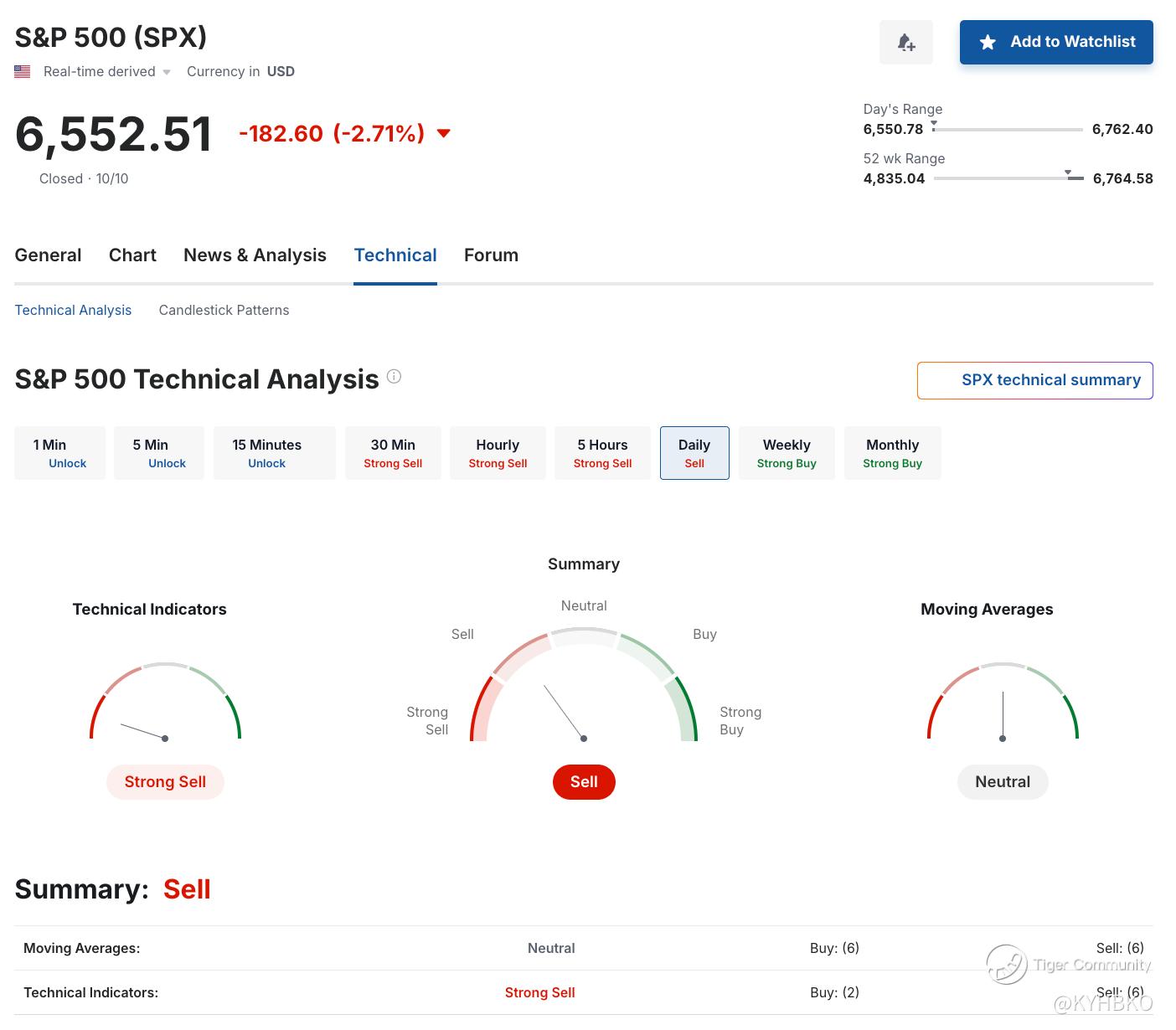 The S&P 500 closed at 6,552.51 on October 6, 2025, marking a sharp decline of -2.7% for the day. Technical analysis at the Daily interval recommends an overall Sell rating, with 12 indicators suggesting a sell signal versus 8 indicators suggesting a buy signal.