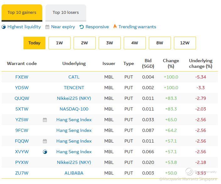 ✴Put warrants dominate this morning's top gainers, with HSI put warrants rallying 57% to 65% given the HSI's 2.6% fall.