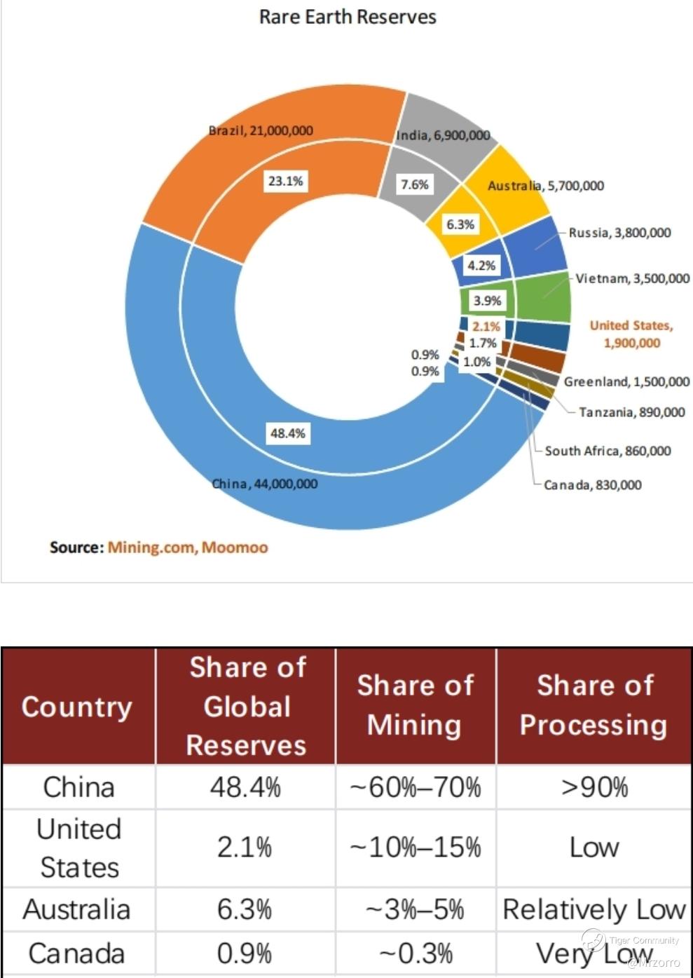 Rare Earth Reserves, Mining, and Processing Shares among China, USA, Canada, and Australia: