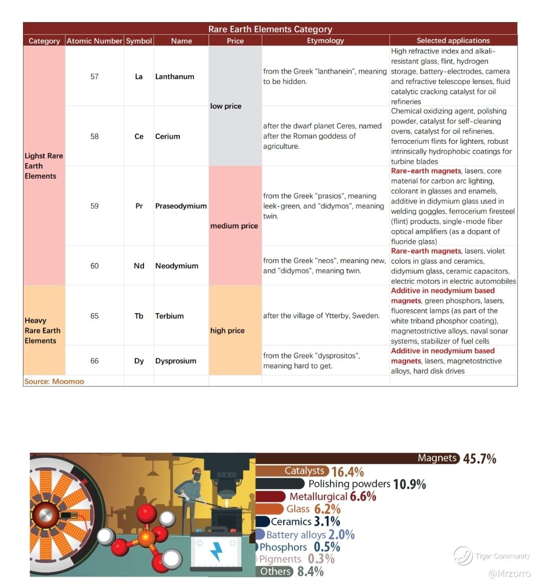 Rare earths refer to 17 elements on the periodic table whose atomic structure gives them special magnetic properties. Commonly used in manufacturing, inexpensive light rare earth elements such as lanthanum and cerium; relatively expensive light rare earths such as praseodymium and neodymium; and costly heavy rare earths such as terbium and dysprosium are often used in magnetic materials. These elements are extensively used in electric vehicles, wind power equipment, nuclear reactors, and military weapons. From Apple iPhones to Tesla motors, rare earth elements are essential, thus their supply impacts the security of trillion-dollar stock market assets.