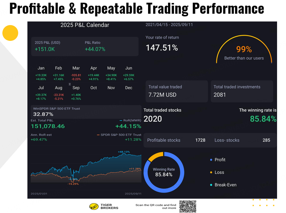 • Trading Performance: He has over 26,000 followers on Tiger Brokers $Tiger Brokers(TIGR)$ , with his trading ideas read over 10 million times. His year-to-date profit is $150k, and his performance is about 44%.