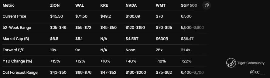 Zions at $45.50 and Western Alliance at $71.50 rebound after a 13% and 11% plunge on loan fraud disclosures, with the S&P 500 at 6,580 and Nasdaq at 22,000 showing caution. A 9.9% ZION rise to $50 and 9.1% WAL to $78 is possible by October-end, with a 10-15% drop to $40-$38.8 (ZION) and $64-$60.8 (WAL) if credit fears spread. The scare’s a blip—position for rebound!