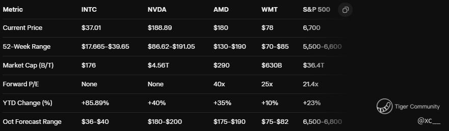 $Intel(INTC)$ $Advanced Micro Devices(AMD)$ $NVIDIA(NVDA)$ Intel is gearing up for its fiscal Q3 2025 earnings release on October 23, 2025, with the stock currently at $37.01 as shown in the finance card above, boasting an impressive 85.89% YTD surge. Q2's $12.86 billion revenue beat the upper end of guidance, even as net profit missed, and management's optimistic call comments propelled shares back to the $37-$38 multi-week resistance. Now, with the S&P 500 at 6,700 and Nasdaq at 22,200, the spotlight is on Q3: will management deliver another bullish outlook to justify the rally, or could a soft guidance trigger a pullback? Dive into the preview, assess the catalysts, and uncover the trades that could make or break this semiconductor showdown.