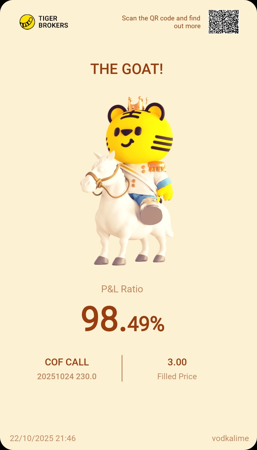 Buy $COF 20251024 230.0 CALL$ at 3am in the morning and sell at 9.40pm in the night. When you done your thesis correctly, this is the result you will get.