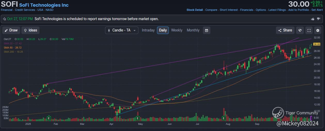 From a technical perspective, SoFi’s stock has spent much of 2025 consolidating between the $7.50 and $9.50 range after a sharp rally earlier in the year. Volume patterns suggest accumulation, as institutional investors quietly build positions ahead of earnings.