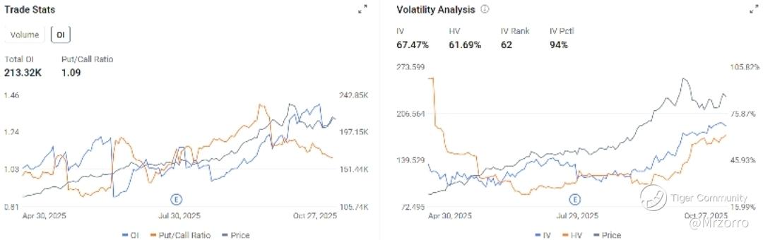 However, the positioning is not one of uniform bullishness. Despite a sharp and sustained rally in the stock price (grey line) leading into the report, the options market is leaning defensively. A Put/Call Ratio of 1.09 reveals a cautious sentiment.