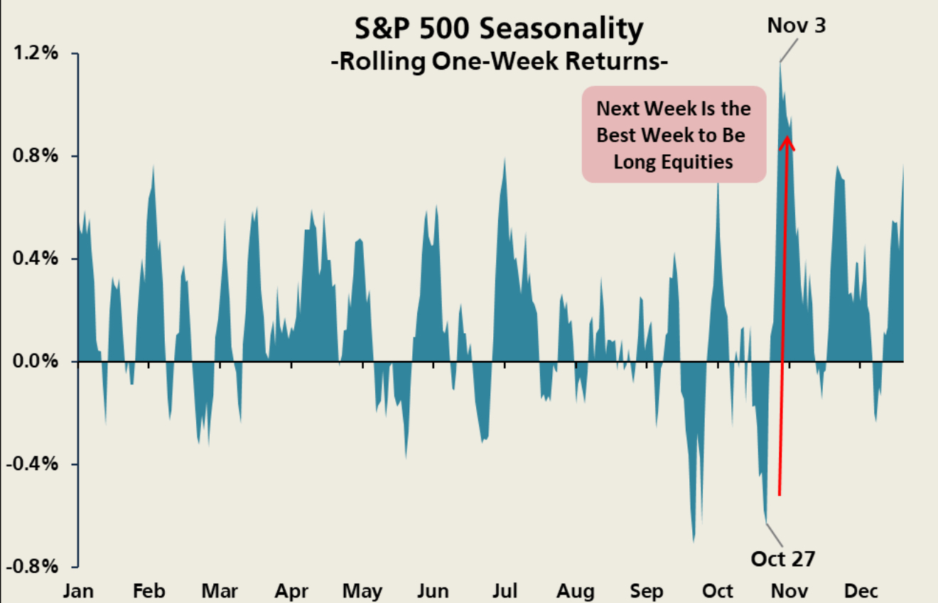 Chart 3: $S&P 500(.SPX)$ seasonality data flags the first full week of November—next week—as the index’s strongest rolling 7-day window of the entire year, averaging +1.2 %.