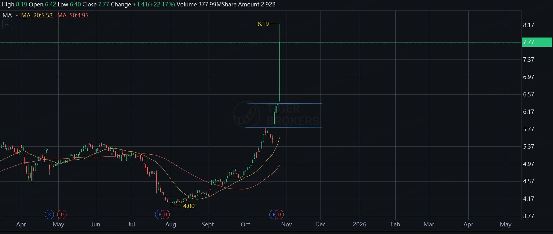 The stock briefly touched an intraday high of $8.19, closing just below the session’s peak.