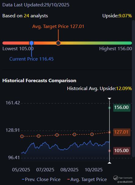 Based on 24 analysts from Tiger Brokers offering 12 month price targets for Exxon Mobil in the last 3 months. The average price target is $127.01 with a high forecast of $156.00 and a low forecast of $105.00. The average price target represents a 9.07% change from the last price of $116.45.