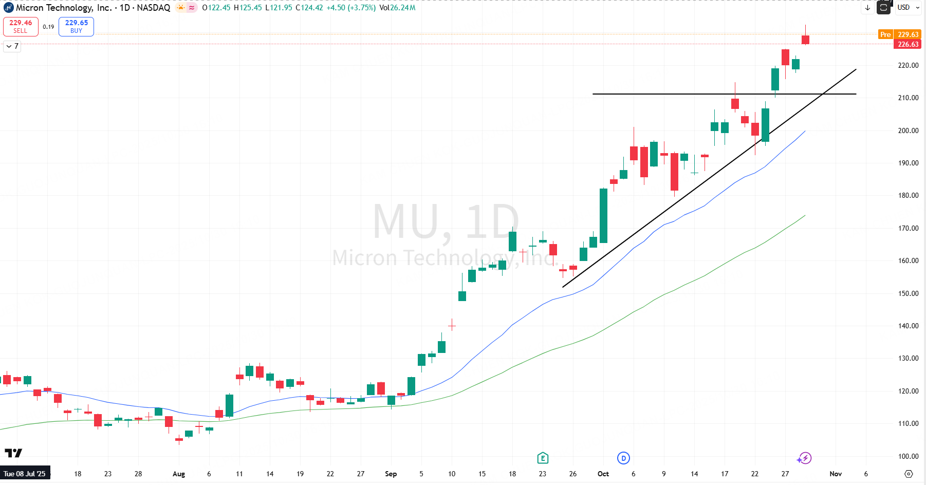 Micron closed $226.63 (+2.13%) after trading $226.10–$232.40 and setting a new YTD high.