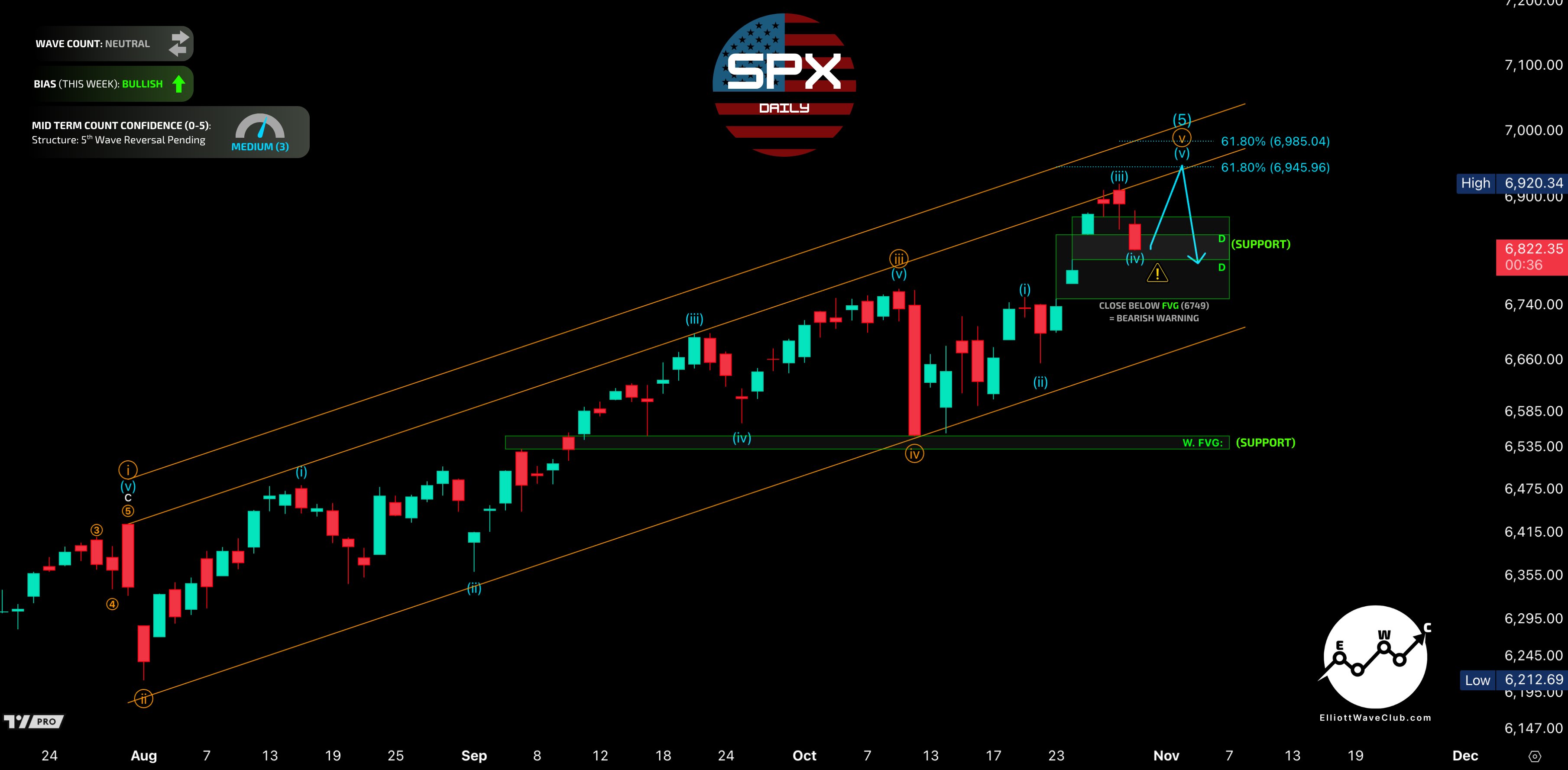 $S&P 500(.SPX)$ expanded its 4th-wave pullback - retracing 38.2% of the 3rd inside Daily FVG support (6870–6807)