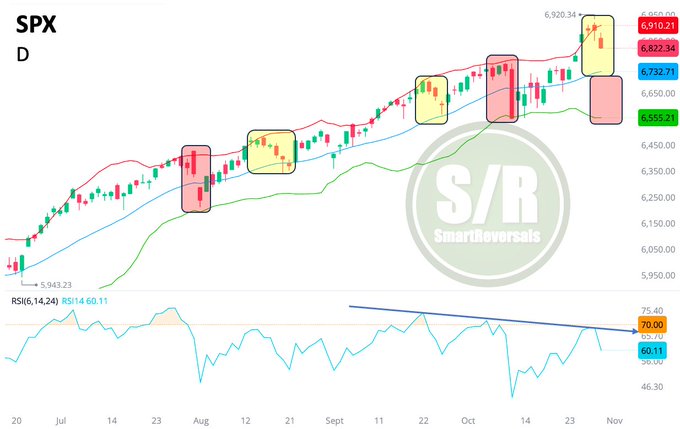 Stock chart of SPX index with daily candlesticks from July to November showing price movement around 5700 to 6000 levels. Red and green candles indicate bearish and bullish periods. Yellow highlighted zones mark potential support areas near the 20-day moving average line in red. Red zones below indicate lower support levels. RSI indicator at bottom shows divergence with price.