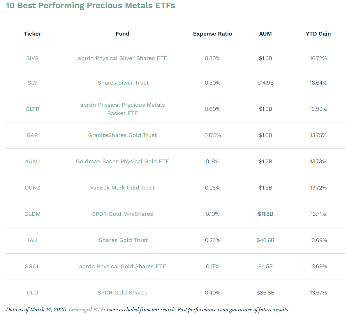 25年表現最優秀的十隻貴金屬ETF包括 $abrdn Physical Silver Shares ETF(SIVR)$ , $白銀ETF(iShares)(SLV)$ , $abrdn Physical Precious Metals Basket Shares ETF(GLTR)$ , $GraniteShares Gold Trust(BAR)$ , $Goldman Sachs Physical Gold ETF(AAAU)$ , $Merk黃金信託ETV(OUNZ)$ , $SPDR Gold MiniShares Trust(GLDM)$ , $黃金信託ETF(iShares)(IAU)$ , $abrdn Physical Gold Shares ETF(SGOL)$ , $SPDR黃金ETF(GLD)$ 。