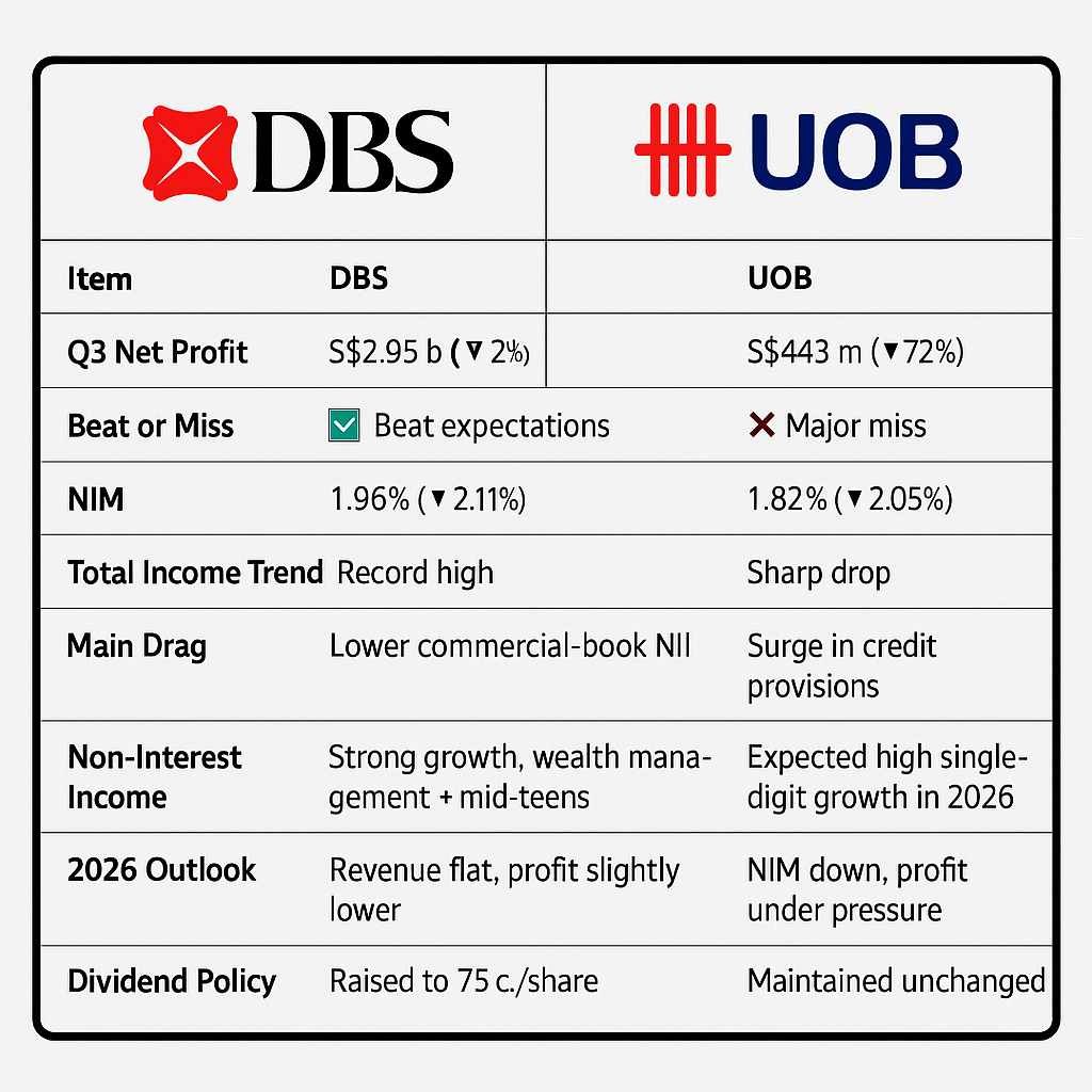 • UOB: Hit hard by heavy provisioning; 2026 margins likely to fall further. Management prioritizes prudence and coverage, but profit recovery depends on credit-cycle stability.