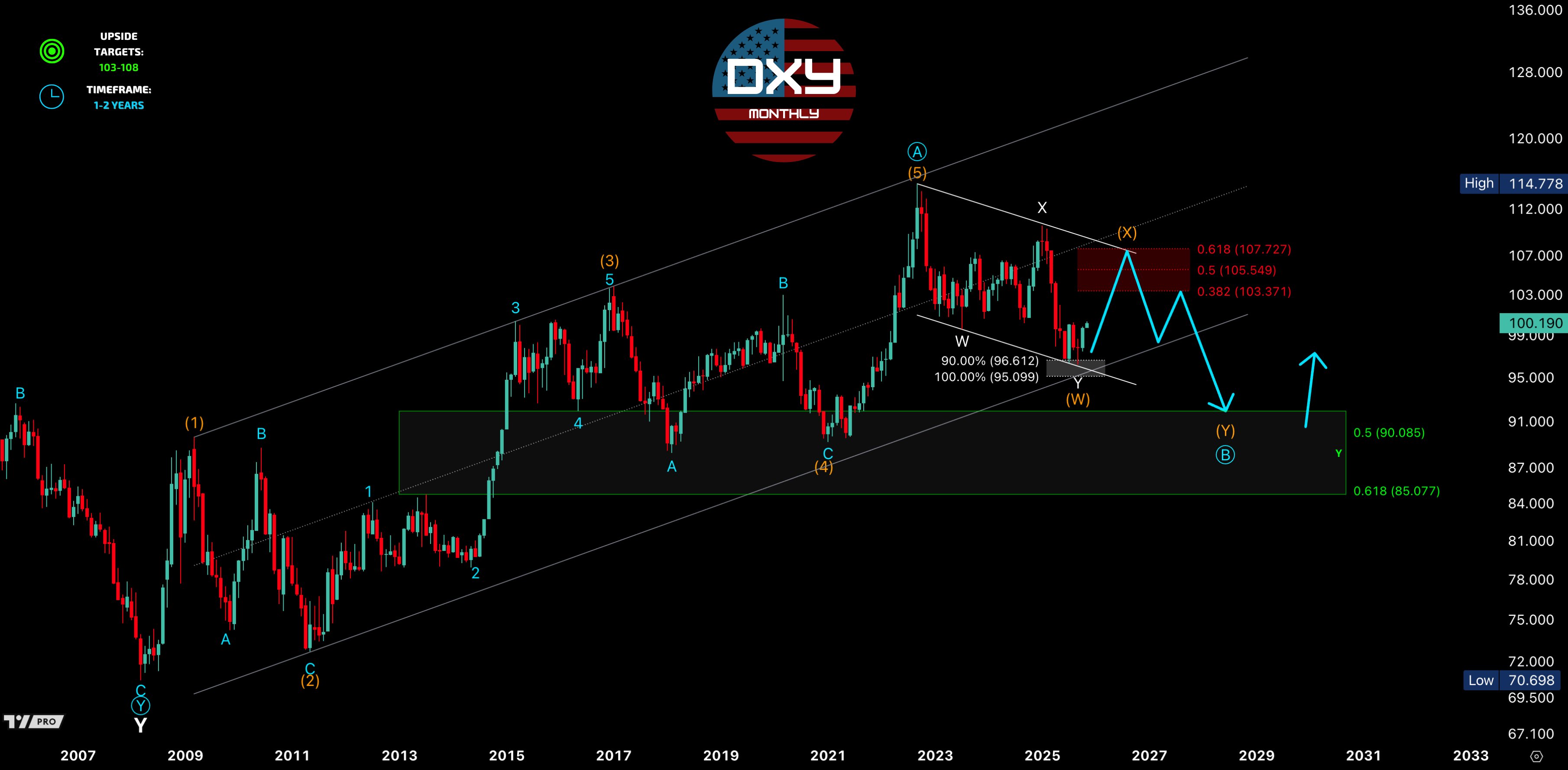 Wave B rally to 96-108 locked (RSI div + Golden Cross)