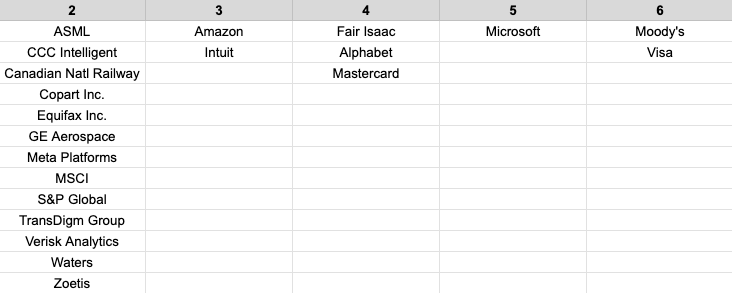 $MSCI Inc(MSCI)$ $ASML Holding NV(ASML)$ $Amazon.com(AMZN)$ $Intuit(INTU)$ $Fair Isaac(FICO)$ $Alphabet(GOOG)$ $Alphabet(GOOGL)$ $MasterCard(MA)$ $Visa(V)$ $Microsoft(MSFT)$ $Moody's(MCO)$
