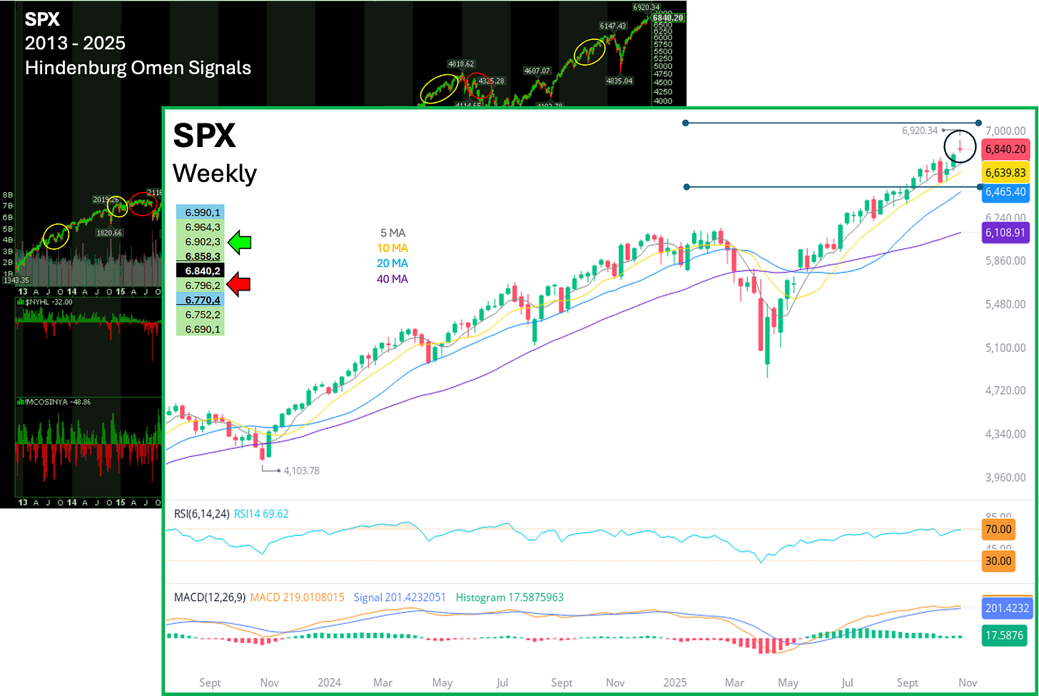 These two charts for the SPX were posted for premium subscribers ahead of the week that just ended, one analyzed the Hindenburg Omen signals, and the other highlighted the weekly candle with a gap, suggesting high odds for a pullback. Very important as well, the price levels at the top left of the white chart, showing the projected central weekly level of $6,858 above the price, indicating a bearish condition.