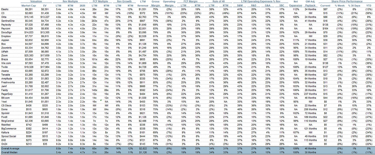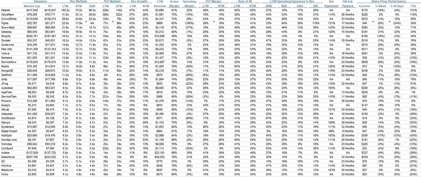 Rule of 40 shows rev growth + FCF margin (both LTM and NTM for growth + margins). FCF calculated as Cash Flow from Operations - Capital Expenditures