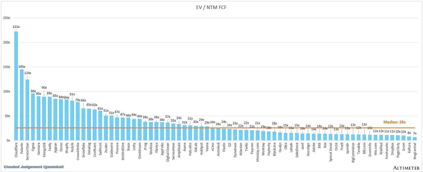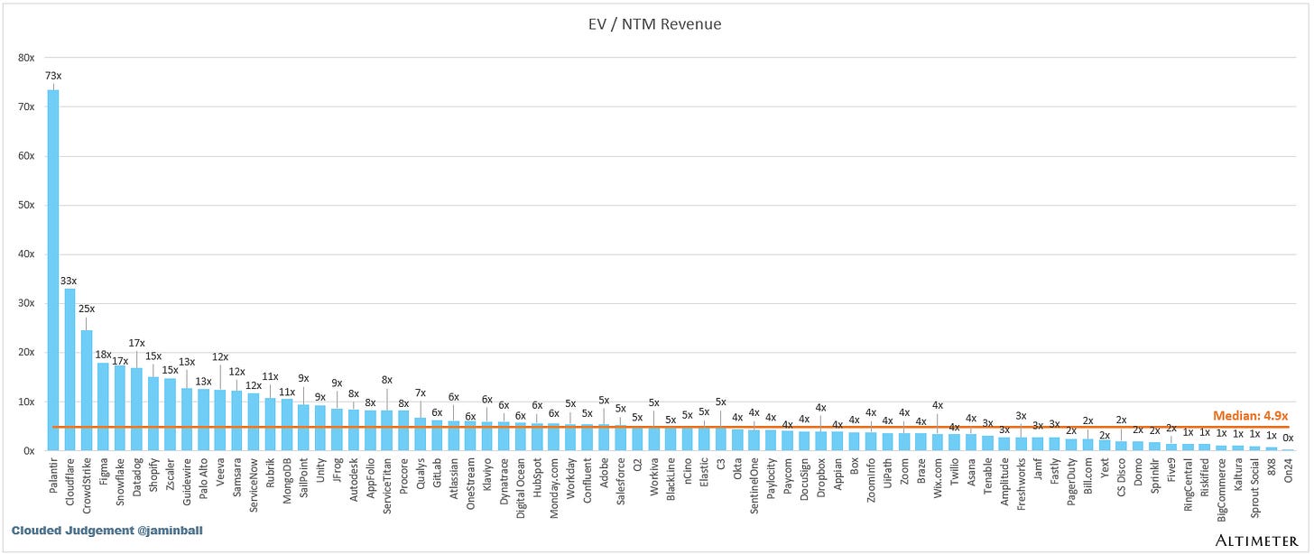 SaaS businesses are generally valued on a multiple of their revenue - in most cases the projected revenue for the next 12 months. Revenue multiples are a shorthand valuation framework. Given most software companies are not profitable, or not generating meaningful FCF, it’s the only metric to compare the entire industry against. Even a DCF is riddled with long term assumptions. The promise of SaaS is that growth in the early years leads to profits in the mature years. Multiples shown below are calculated by taking the Enterprise Value (market cap + debt - cash) / NTM revenue.