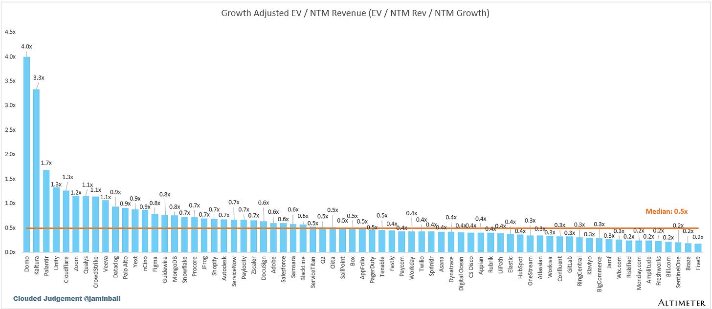 The below chart shows the EV / NTM revenue multiple divided by NTM consensus growth expectations. So a company trading at 20x NTM revenue that is projected to grow 100% would be trading at 0.2x. The goal of this graph is to show how relatively cheap / expensive each stock is relative to its growth expectations.