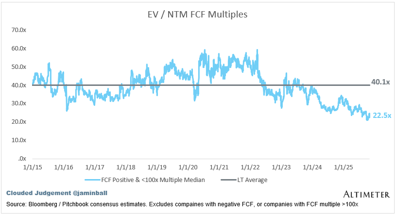 The line chart shows the median of all companies with a FCF multiple >0x and <100x. I created this subset to show companies where FCF is a relevant valuation metric.