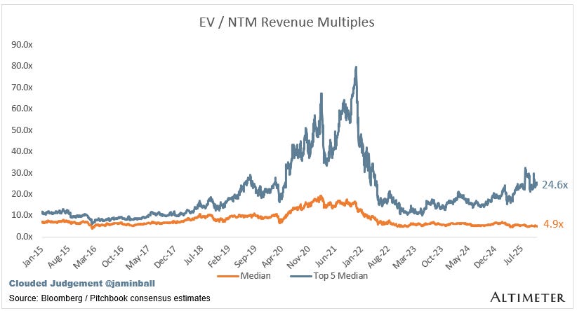 2020–2021 and today, I’d argue, were / are expansionary phases. A few years back, the driver was low interest rates. Today, the driver is AI. No one wants to fall behind, and everyone is willing to spend to figure it out. Whether that means experimenting with new tools, building internal capabilities, or buying growth stories tied to AI. The fear of missing the next platform shift has become its own form of FOMO, and it’s fueling a new wave of aggressive software spending.