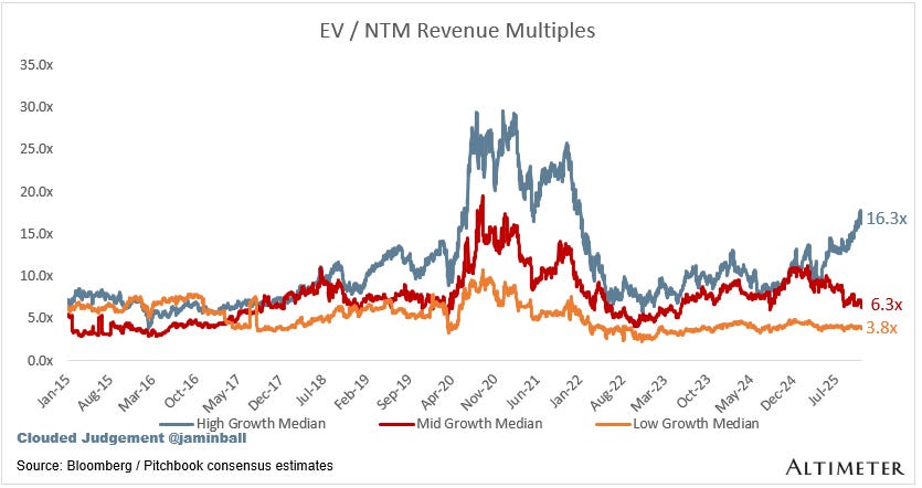 In the expansionary phase, buyers scoop up software almost indiscriminately. There’s little concern for cost or efficiency, what matters is speed. It’s about accelerating product development, capturing market share, or outspending competitors to stay ahead, all under the assumption that growth will take care of everything else. During this phase, public markets shift their focus entirely to growth over profits. Take a look at the multiples chart I post later on breaking out multiples by high, medium, and low-growth companies. You can see the high-growth bucket has seen multiple expansion this year, while the mid-growth bucket has seen steady contraction.