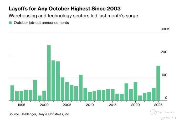 CNBC: “Announced corporate job cuts surging past 1 million so far this year, with 153,000 new layoffs just in October, according to Challenger. That is the worst October since 2003.”
