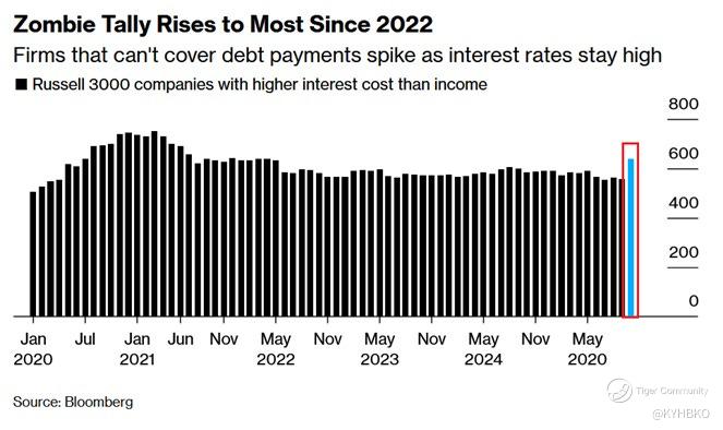 The number of US “zombie” companies is surging. The number of zombie companies in the Russell 3000 jumped +83 in October, to 639, the highest since December 2021. Zombie companies are firms that cannot generate enough profit to cover their interest payments and are staying afloat only through continued borrowing. Many of the firms that entered zombie status in October were in health care and biotech, sectors now struggling with soaring costs and declining federal support. To put this into perspective, the recent peak was 749 zombie firms in March 2021. Many small companies are struggling. - X user The Kobeissi Letter